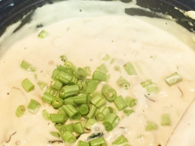 加入檸檬葉、香茅及四季豆丁,繼續熬煮,加牛奶、糖來調整辣度