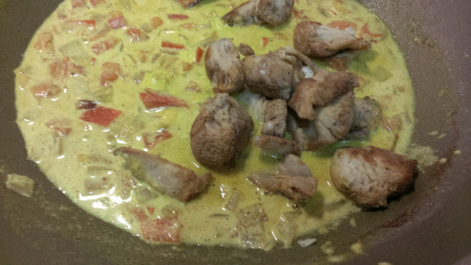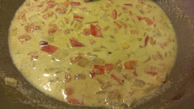 加入椰漿,再加入薑黃粉+荳蔻+肉桂粉+辣椒粉,小火煮到沸騰。並加入鹽調味。