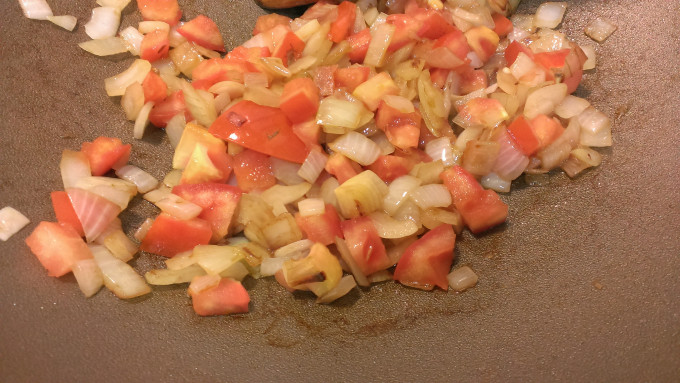起油鍋,先炒洋蔥丁成焦糖色,再加入牛蕃茄丁拌炒,加入薑片和蒜泥,拌炒約5分鐘。