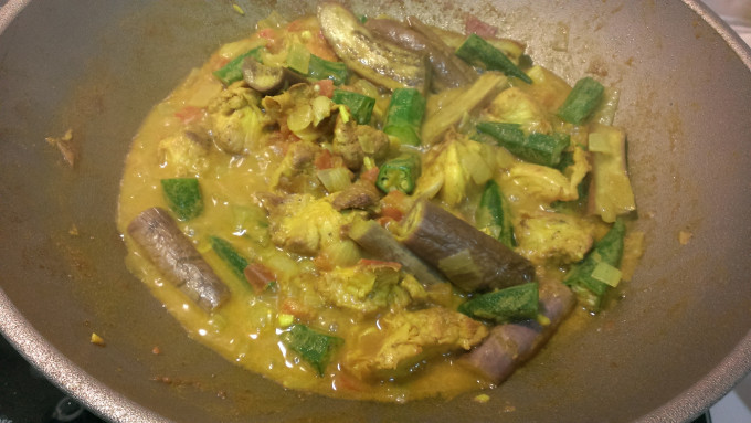 加入秋葵煮約5分鐘,再加入茄子煮到沸騰,這道菜就完成了。
