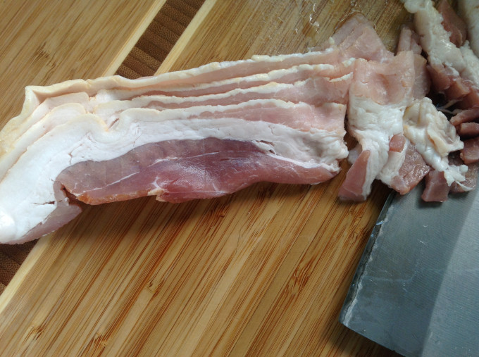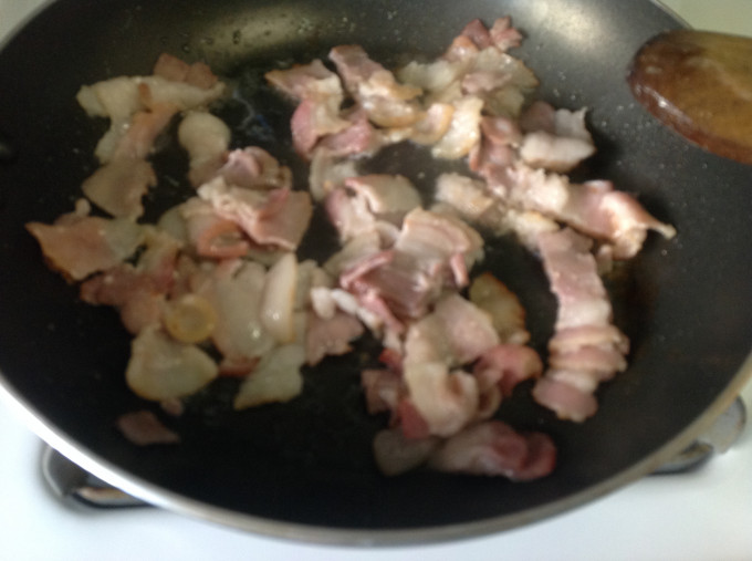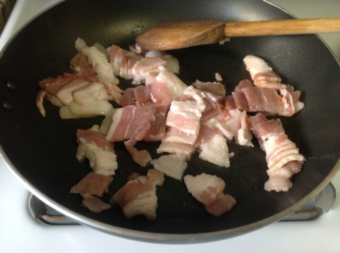 培根切片後,用平底鍋以小火無須加油,用木剷杓子去煎炒