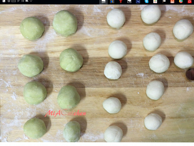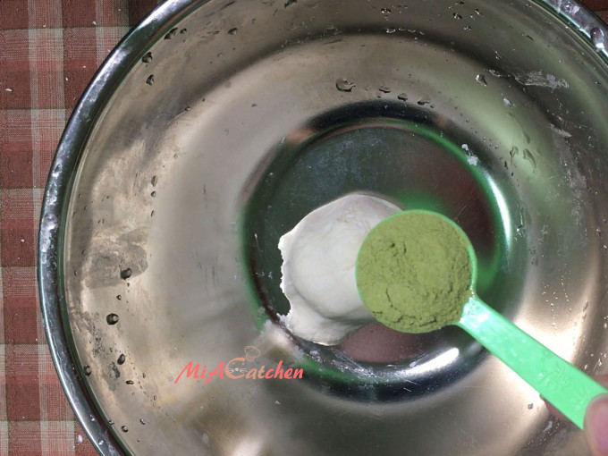 將糯米糰分成一半,一半的湯圓加入 1 匙抹茶粉混合均勻,一半的吃原味!