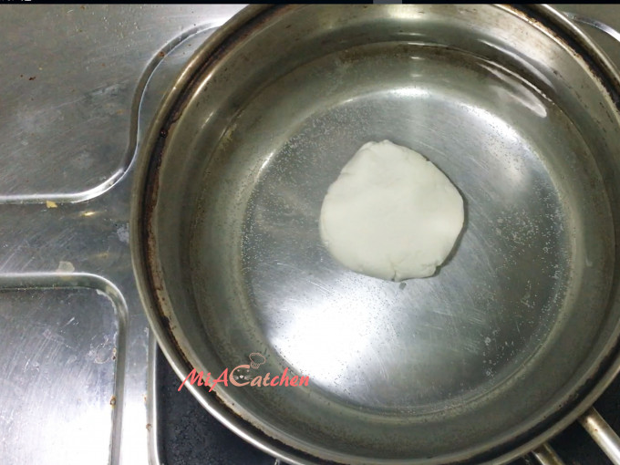 將糯米粉團分成 4 等份,取 1/4 壓成平板狀,放入滾水中煮熟(浮起即可),此為「粿碎」或叫「粄母」