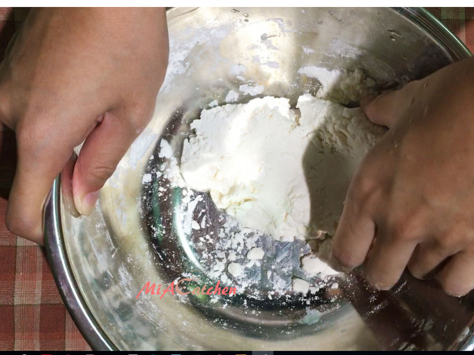 將粄母與剩餘 3/4 的糯米糰、10g 玉米粉混合揉捏,這邊可以盡情的揉均勻沒關係,記得粄母可能會有些燙手,大家要注意!