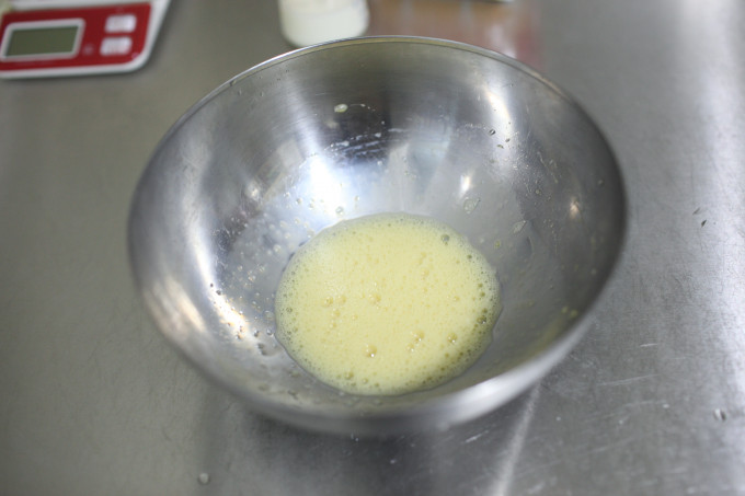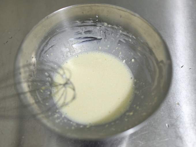 把糖和一咪咪鹽加入蛋汁中拌勻。(打到像照片有中打起泡即可)