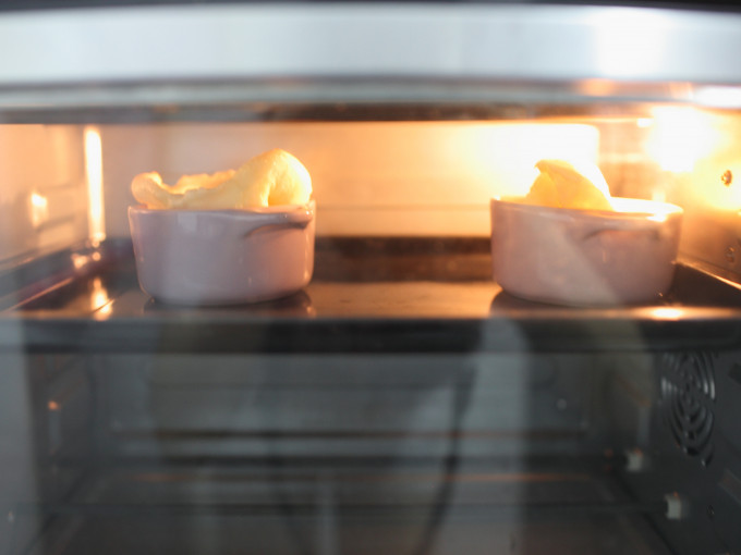 放入烤箱下層用下火200度烤15-20分鐘,烤到荷蘭鬆餅膨脹起來再移到上層用上火180度下火200度烤至表面上色就完成了。