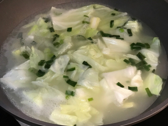 下高麗菜及玉米筍稍微拌炒,加入雞湯,不足的部分可以加水,開中大火煮滾。