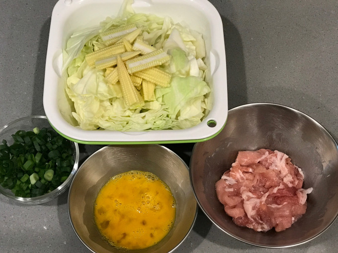 肉片用醃料拌勻,蛋加入1小撮鹽打散,高麗菜切小塊適口大小,玉米筍縱切對半再橫切,蔥切成蔥花,另煮一鍋水準備煮麵。