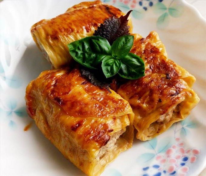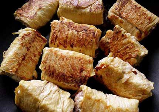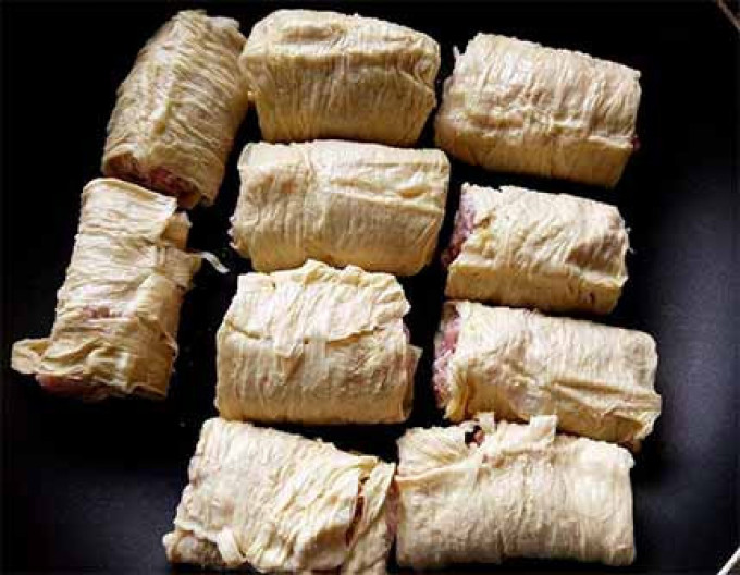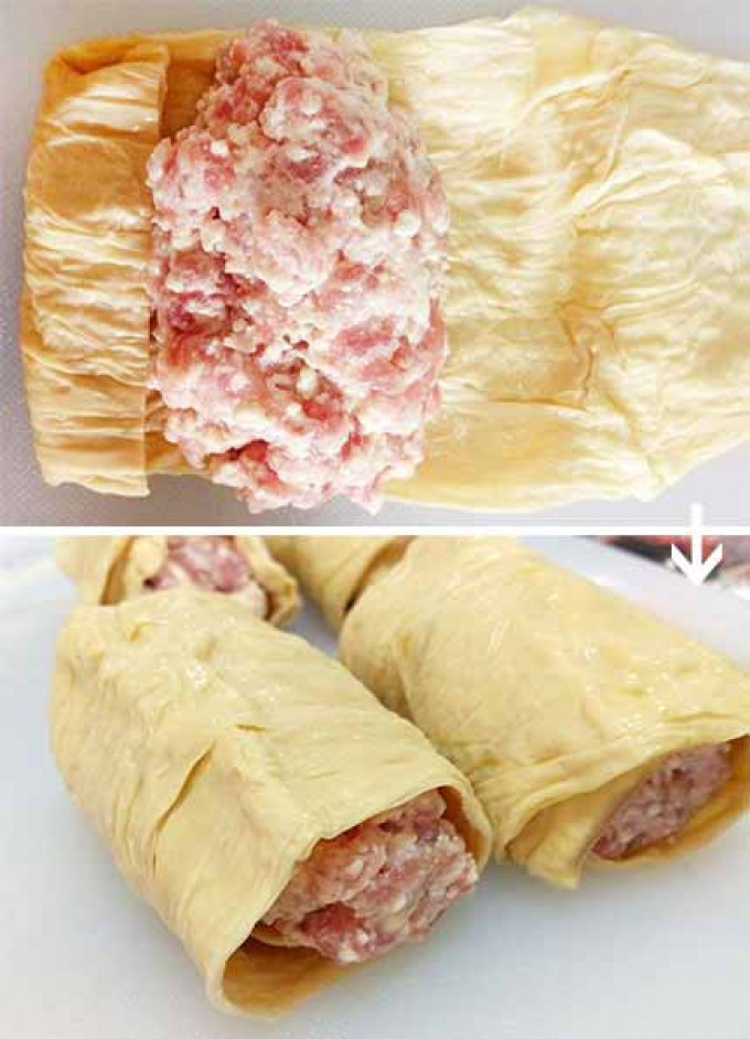 取1條嫩豆皮,在一端放入1份肉餡(約60g)後捲起,收口處可抹些太白粉幫助黏合