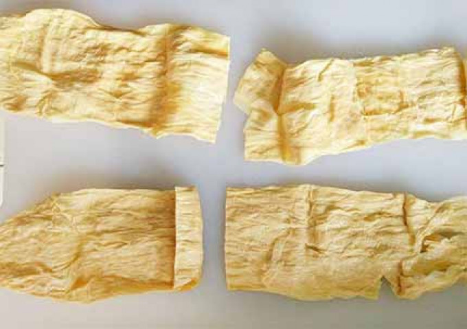 將嫩豆皮小心攤開成一長條,並分切成2份,全部總共10份長條