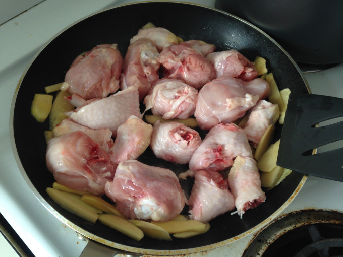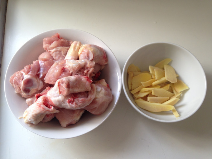 將雞肉洗淨,剁塊,薑切成薄片.