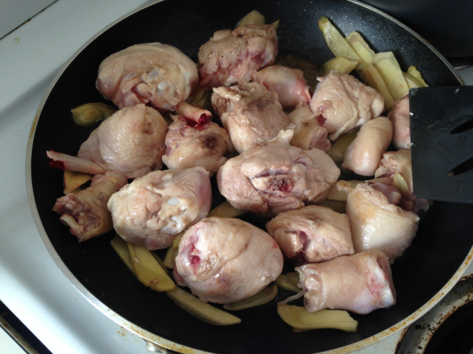 雞肉炒至些微的金黃色即可,然後倒入米酒.