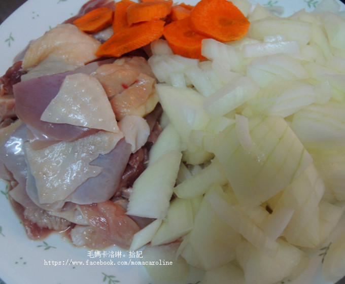 雞腿肉切一口大小、洋蔥切丁、紅蘿蔔切小塊