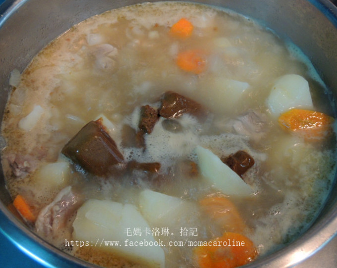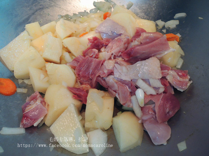 放入洋蔥炒出香氣之後依續放入馬鈴薯、紅蘿蔔、雞肉繼續拌炒,接著加入水蓋過食材蓋上鍋蓋煮