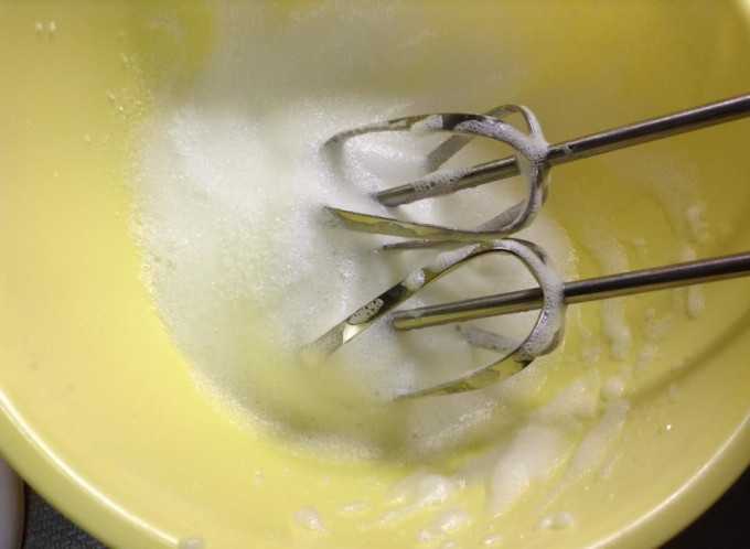 蛋白打發至呈泡泡狀之後,放入半量糖。