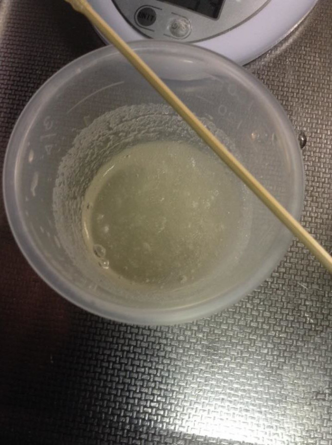 準備一個放入冰塊或冰袋的盆子,放入水在盆子裡,把小鍋放在冰袋上降溫至約25度左右(一邊降溫,一邊攪拌)