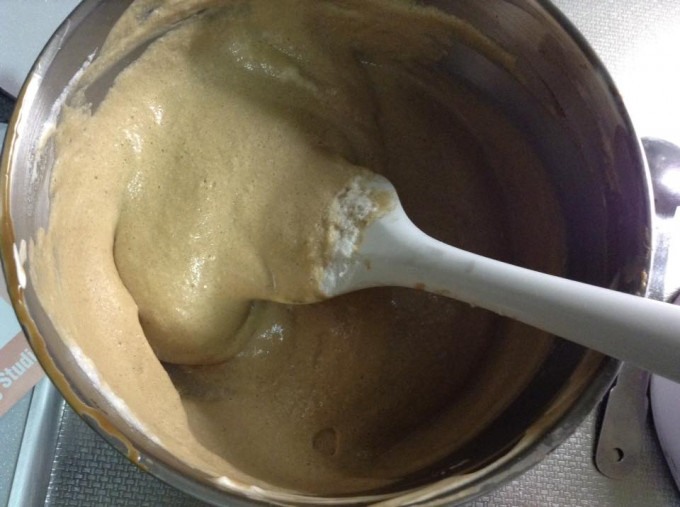 再加入打發蛋白,和加鮮奶油時的感覺一樣,分兩次加入。