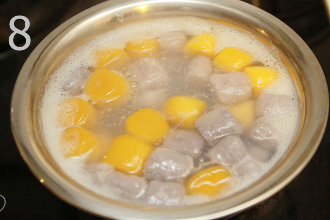 水燒開後,把做好的芋圓和蕃薯圓投入熱水中,在水還未再次燒開前要不斷攪拌以防黏底,煮至浮起;