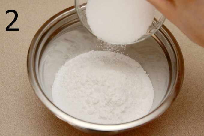 趁著蒸芋頭的空檔,把蕃薯粉、太白粉以及糖倒在一起,以筷子攪拌使其混合均勻;