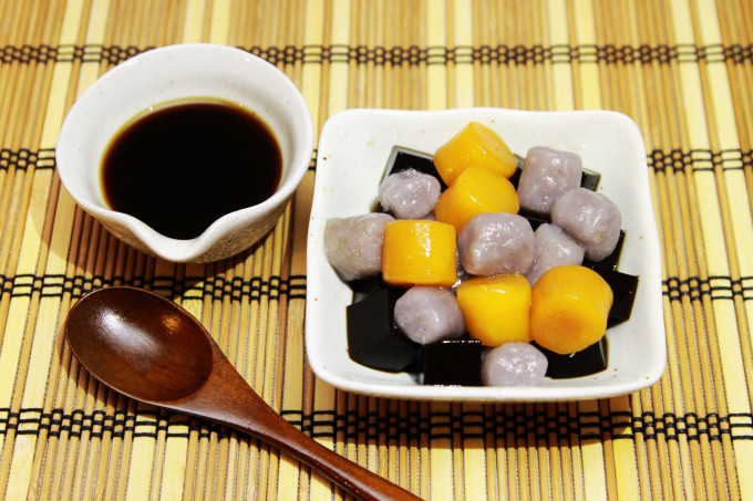 碗中先放涼粉/仙草,再放煮熟的芋圓蕃薯圓,淋上糖漿,便可享用。