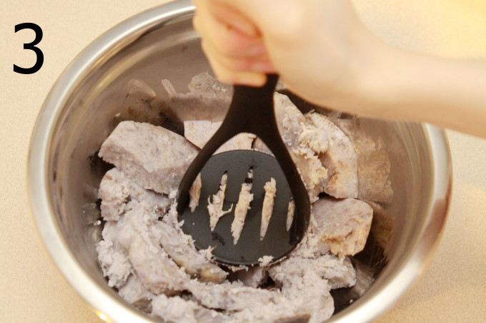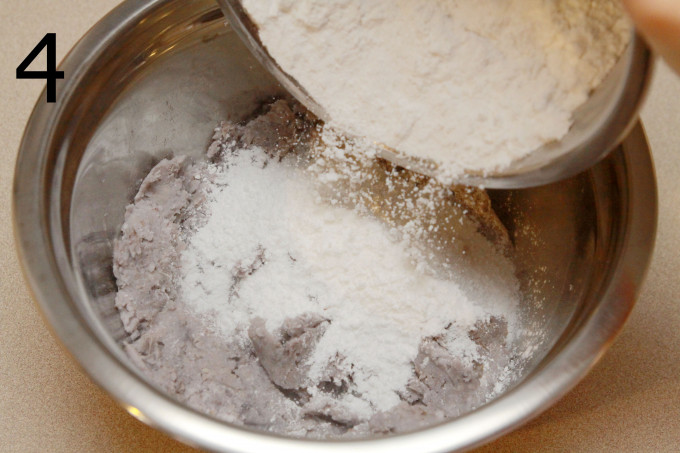 將粉類和糖倒入芋泥的盤中,分幾次加入清水,先用筷子略為攪拌,後用手揉搓;