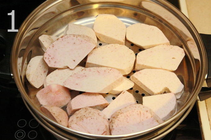 將芋頭去皮,洗淨切塊,放上蒸鍋以中大火蒸二十分鐘至軟熟;