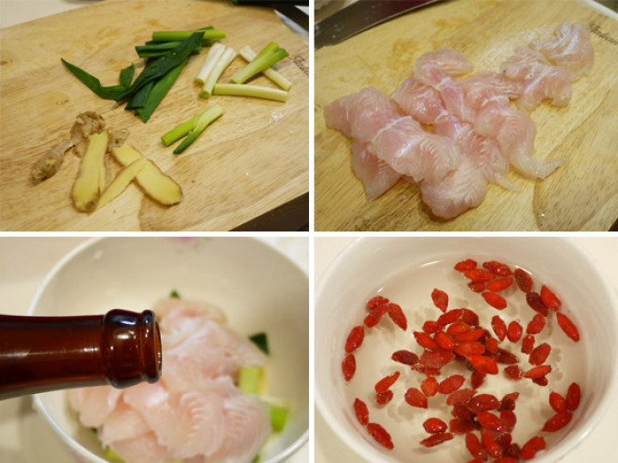 魴魚切斜刀片、蔥切大段,蔥白用刀拍個幾下、薑切片。取一大碗,將切好的魚片加入米酒、蔥段、薑片、鹽、白胡椒粉與香油抓過後一起醃漬備用。枸杞泡水,水蓮洗淨備用。
