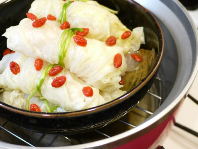 將包好的白菜鮮魚捲放入有深度的盤子裡,撒上泡軟的枸杞,放入大同電鍋,外鍋放一杯水,蒸至開關跳起即可上桌食用。(比較重口味者,可在白菜捲外面再撒上一層薄薄的鹽)。