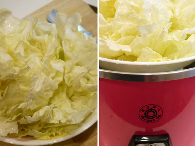 醃魚片的期間,取跟魚片數量一樣的白菜葉,洗淨後放入深盤中,再放入大同電鍋裡,外鍋放一杯水,蒸軟備用。(這樣清蒸比水煮更能保留大白菜的原味)