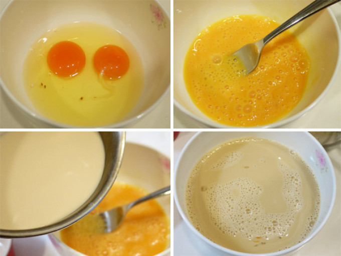 攪拌好的鮮奶茶蛋液過濾個2-3次,將多餘的泡泡撈掉再分裝至容器裡。將容器輕輕敲桌,把裡面的空氣敲出來