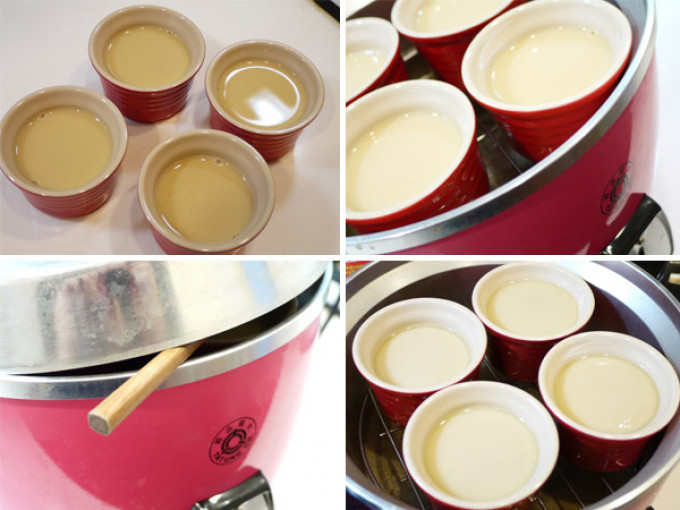 大同電鍋外鍋放一蒸架,將布丁液與容器放到蒸架上。外鍋放一杯水,鍋子與鍋蓋中間夾一支筷子避免水蒸氣流到布丁表面上。按下開關後等開關跳起即可食用