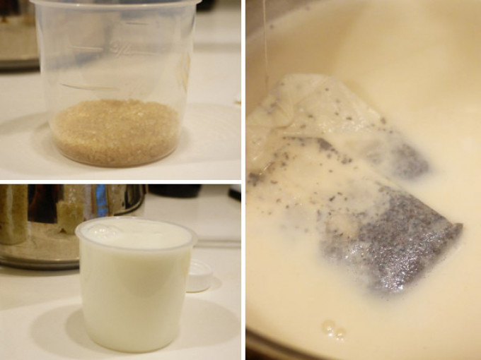 糖與牛奶放入小鍋中用中小火慢慢加熱並用湯匙不停攪拌至糖融化,不需要等牛奶沸騰。糖融化後加入伯爵紅茶茶包泡至牛奶液變溫涼。