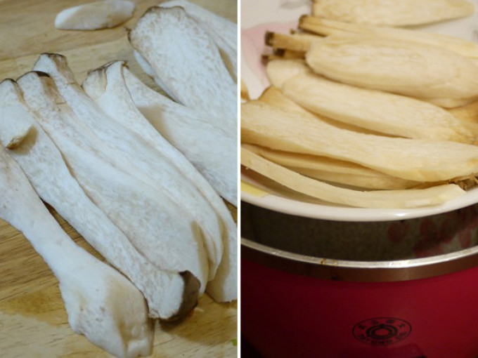 杏鮑菇用乾廚房紙巾擦乾,直向切成薄片後放入大同電鍋,外鍋放一杯水將杏鮑菇片蒸軟後取出放涼。