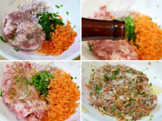 青蔥、紅蔥頭與紅蘿蔔切成碎。取一碗,放入豬絞肉與切碎的蔬菜料,並加入所有調味料後攪拌均勻備用。