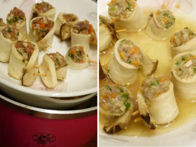 放涼的杏鮑菇片捲成圈後用牙籤固定,將調味好的豬肉餡填進杏鮑菇圈。