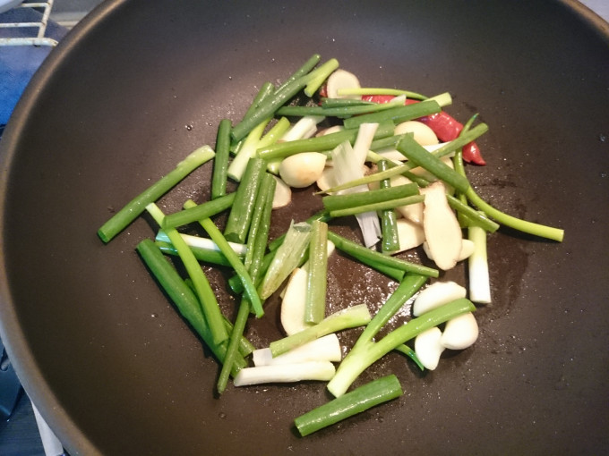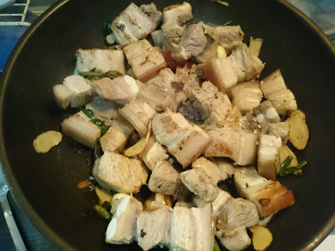 拿一個可以放入所有肉塊的大鍋子,先炒香辛料(蔥、薑、蒜頭、辣椒)炒出香氣後,再放入燙好的五花肉拌炒。