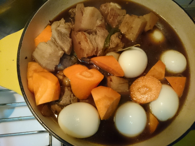 移入燉鍋後,加入米酒、醬油、水,開大火煮滾後撈除浮渣泡泡,轉小火,放入紅茶包、八角、月桂葉,也放入紅蘿蔔和白煮蛋,蓋上鍋蓋燉煮45~60分鐘。燉煮之中務必要稍微開蓋檢查是否所有食材都有浸泡到醬汁。