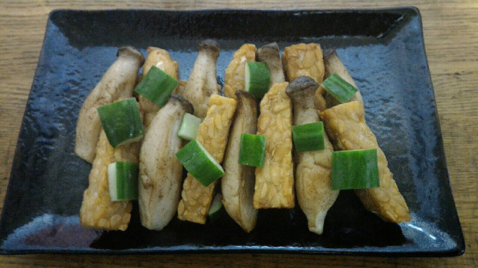 將天貝和杏鮑菇放在一鍋中,均勻灑上胡椒鹽,盛盤,在擺上小黃瓜即可