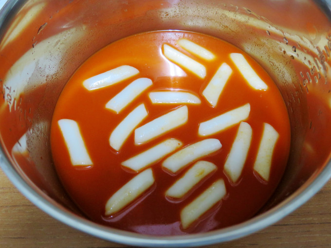 準備大同電鍋內鍋,加入韓式年糕200g和事先拌勻,電鍋外鍋加入米杯水一杯,按下開關開始蒸煮