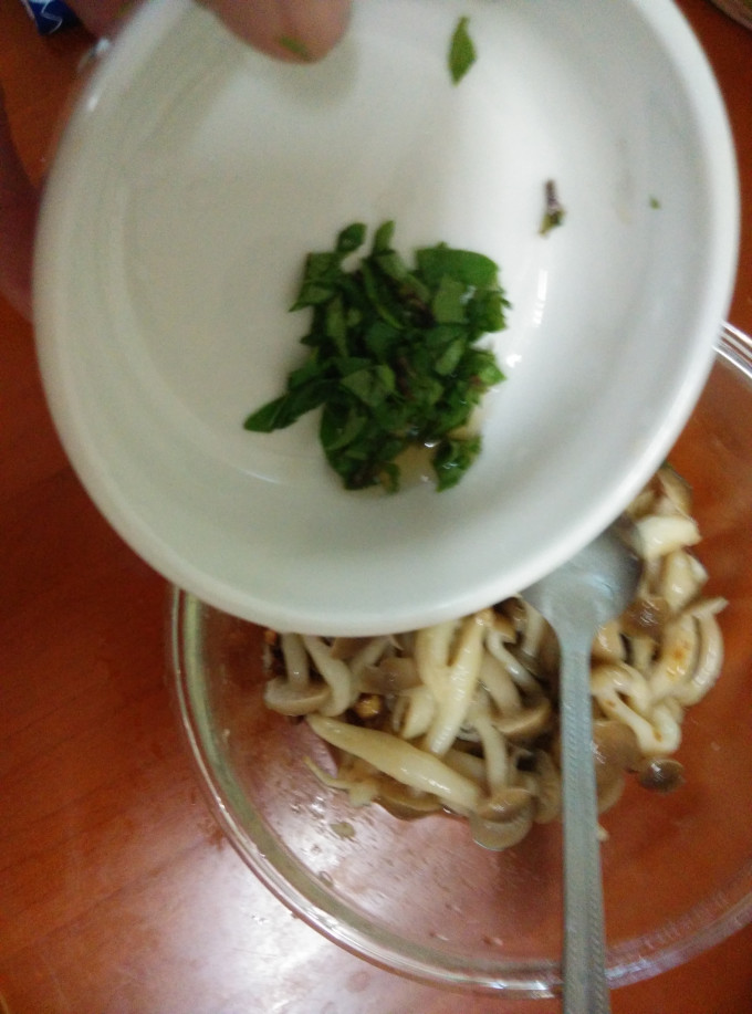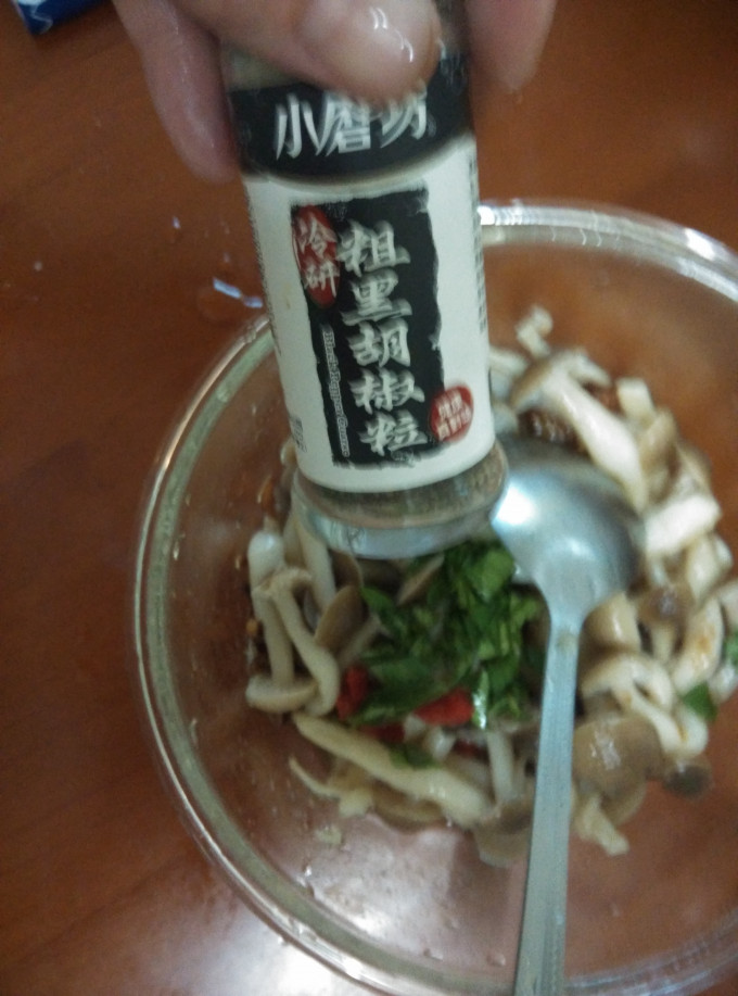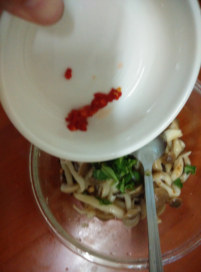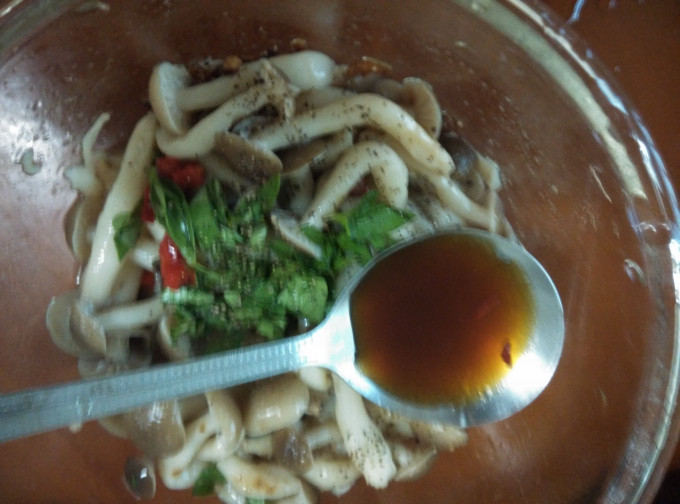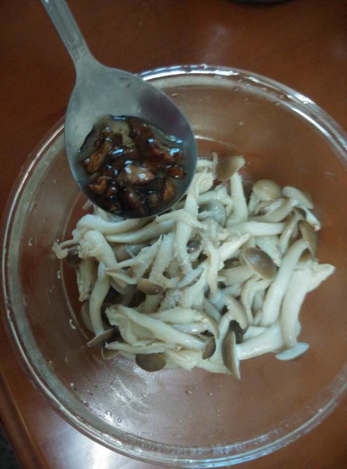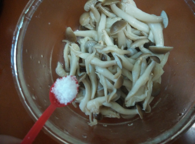 將汆燙好的鴻禧菇放入深碗中,加入1匙鹽巴。
