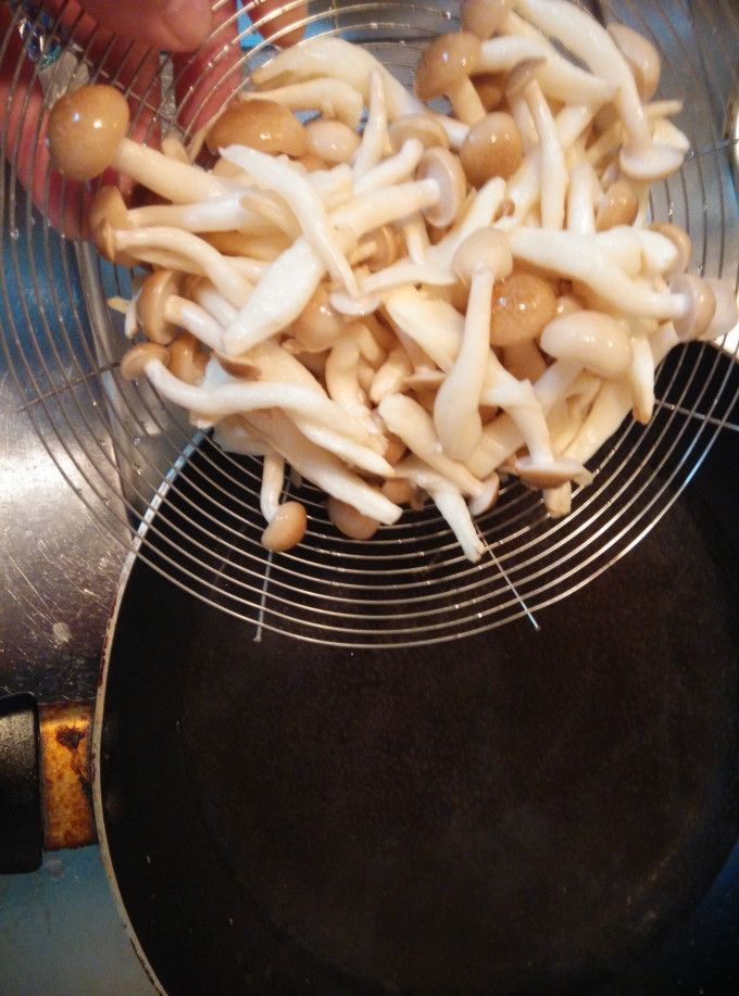 將鴻禧菇去掉蒂頭,剝成小朵狀,以水沖洗掉雜質,瀝乾後備用;煮一鍋水,水開後將處理好的鴻禧菇放入汆燙目3分鐘,即可撈出瀝乾水份。