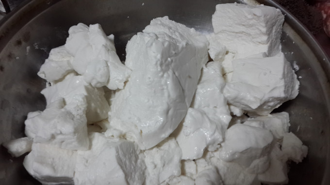 取一盆子將粿粹捏散後加入粿母揉捏均勻成糯米糰