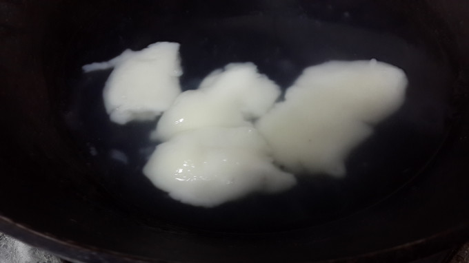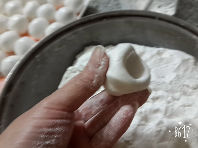 取一個圓糯米球用大拇指壓一個洞後轉圈圈塞入芝麻球