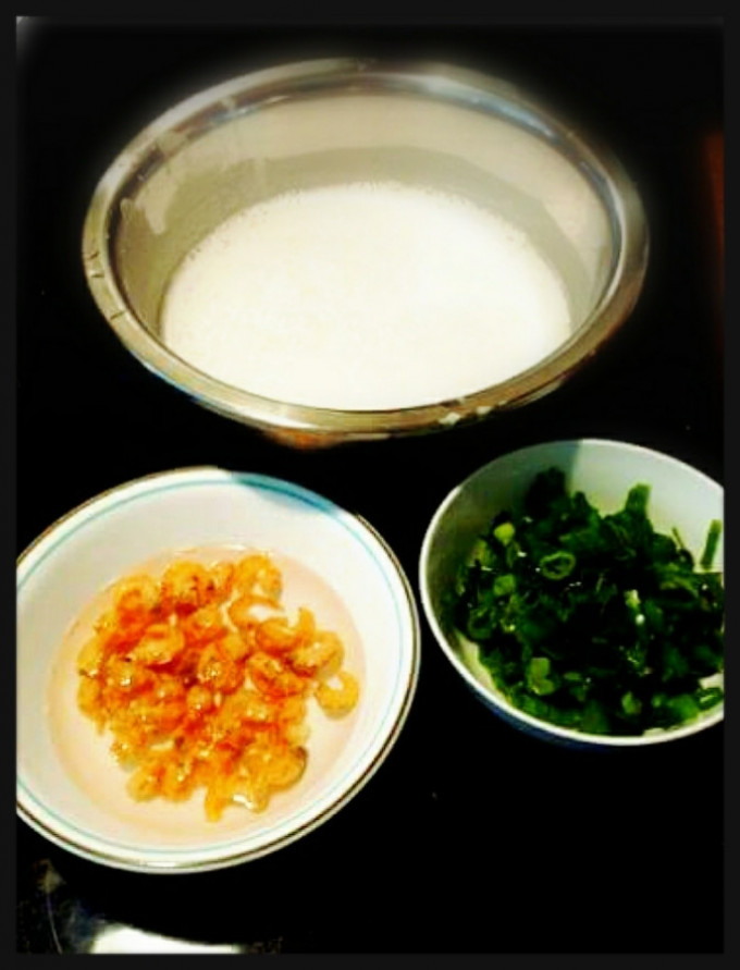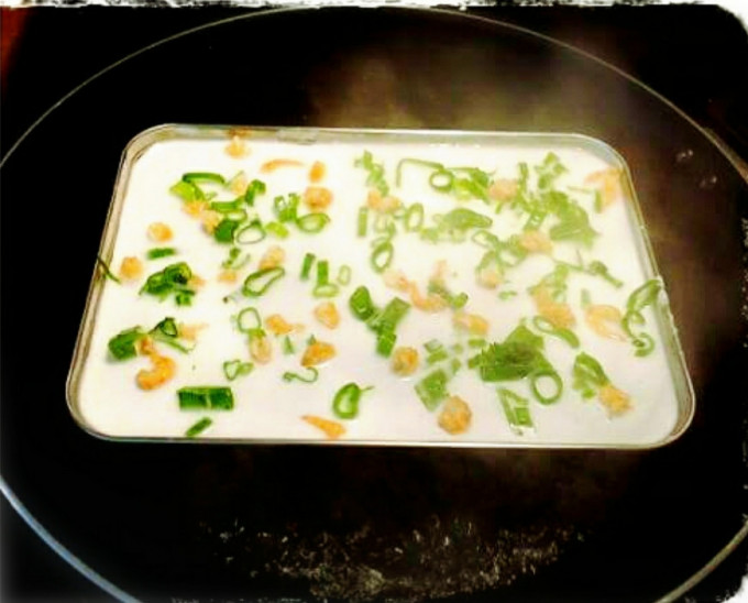 預備長淺鐵盤一個,底部掃油,倒下適量粉漿,再均勻撒下蝦米同蔥,❴記住整個蒸嘅過程,都不用蓋煲蓋❵