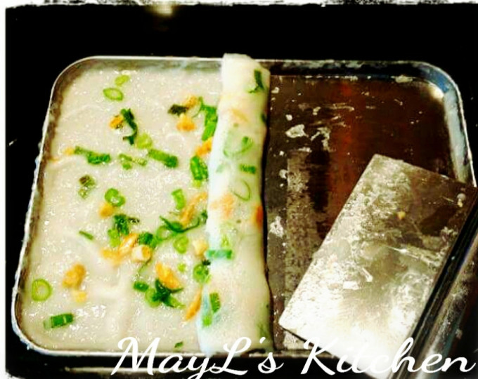 每盤太约蒸3分鐘,見粉漿呈透明状,即代表已差不多熟透,用刮刀慢慢從右邊向左邊刮起,這時可按自己喜歡,決定腸粉粗幼。