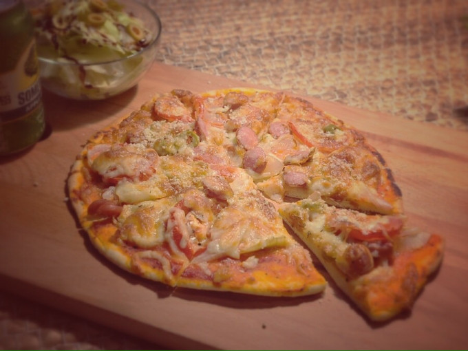 食材 : 蕃茄醬, 牛蕃茄, 義式香腸, 洋蔥, 橄欖, 帕瑪森起司, 義大利香料, 鹽巴, 黑胡椒, 橄欖油, 高筋麵粉, 低筋麵粉, 即溶酵母, 砂糖, 鹽巴, 水, 橄欖油