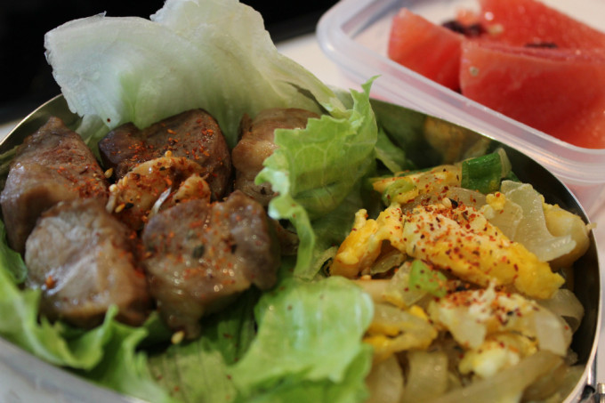 食材 : 豬肉, 洋蔥, 雞蛋, 糙米飯, 紅色水果, 生菜葉