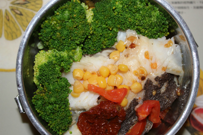 食材 : 五穀米, 鱈魚, 蕃茄, 油漬蕃茄(罐頭), 青花椰菜, 玉米粒