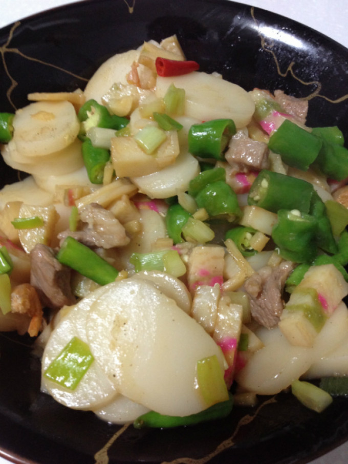食材 : 寧波年糕, 沙拉油, 里肌肉, 青辣椒, 紅辣椒, 蝦米, 魚板, 蒜末, 蔥, 醬油, 米酒