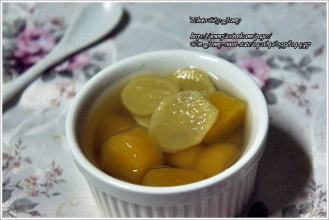 食材 : 地瓜, 水, ]太白粉, ]水, ]太白粉, ]地瓜粉, ]糖, ]水, ]冰糖, ]薑泥或薑片